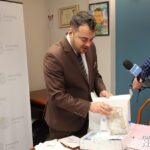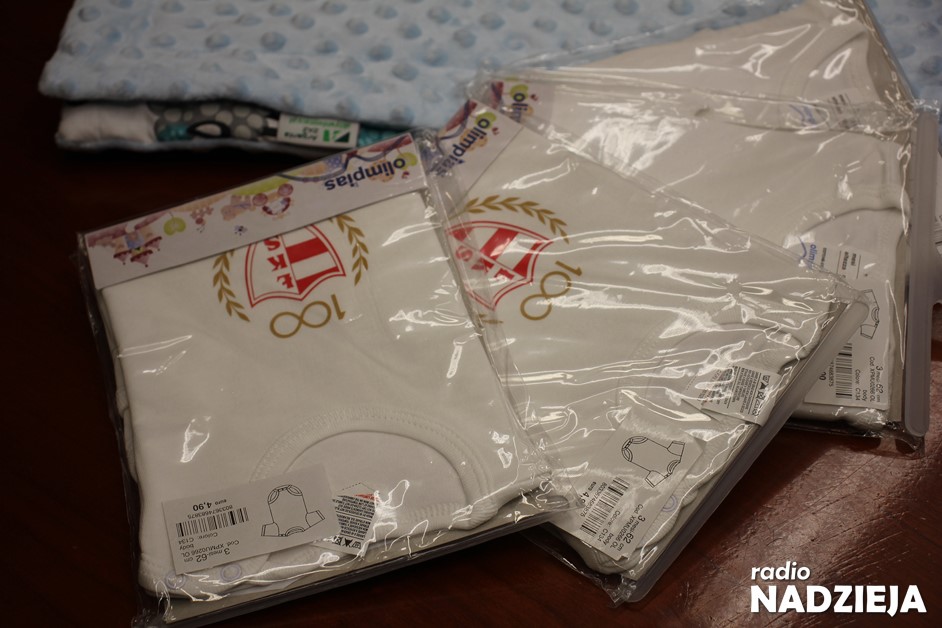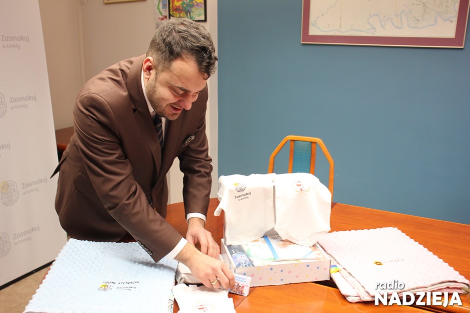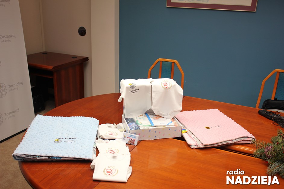 Kocyk dla niemowlaka, albo w kolorze różowym albo w niebieskim. Dodatkowo niebieskie pudełko, w którym znajdują się potrzebne przedmioty i też artykuły dla niemowlaków. Dodatkowo pakiet 600 minut do wykorzystania w Parku Wodnym. No i nowość, czyli body niemowlęce w barwach naszego Łomżyńskiego Klubu Sportowego i też z logo promocyjnym miasta Łomża „Zasmakuj w Łomży” – wyjaśniał samorządowiec.