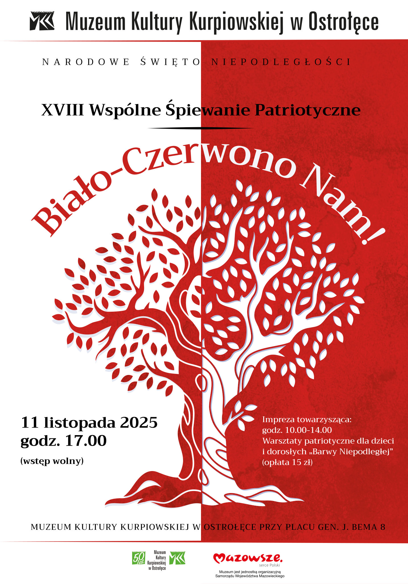 ,,Biało – Czerwono Nam!” – Ostrołęka śpiewająco będzie świętować 107. rocznicę odzyskania przez Polskę Niepodległości. We wtorek 11 listopada na dziedzińcu Muzeum Kultury Kurpiowskiej przy Placu gen. Józefa Bema 8 w Ostrołęce odbędzie się wyjątkowy koncert.