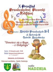 X Przegląd Przedszkolnej Piosenki Religijnej odbędzie się 23 listopada, a patronatem honorowym objęli to wydarzenie proboszcz parafii pw. Wniebowzięcia Najświętszej Maryi Panny, ksiądz dr Jan Okuła i burmistrz miasta, Jerzy Bauer.