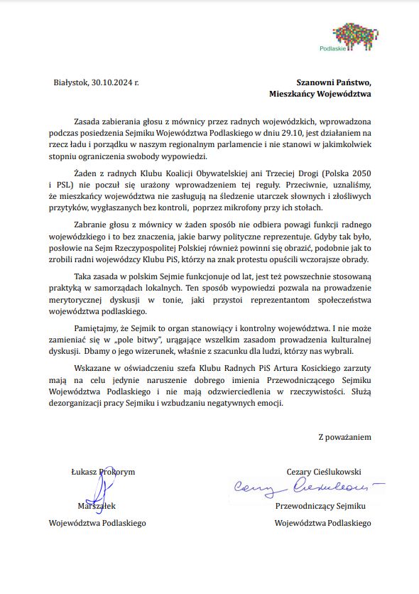 Poniżej publikujemy oświadczenie na temat obrad Sejmiku Województwa Podlaskiego, które zostały przerwane we wtorek, 29.10., podpisane przez Marszałka Łukasza Prokoryma, a także Przewodniczącego Sejmiku Województwa Podlaskiego, Cezarego Cieślukowskiego.