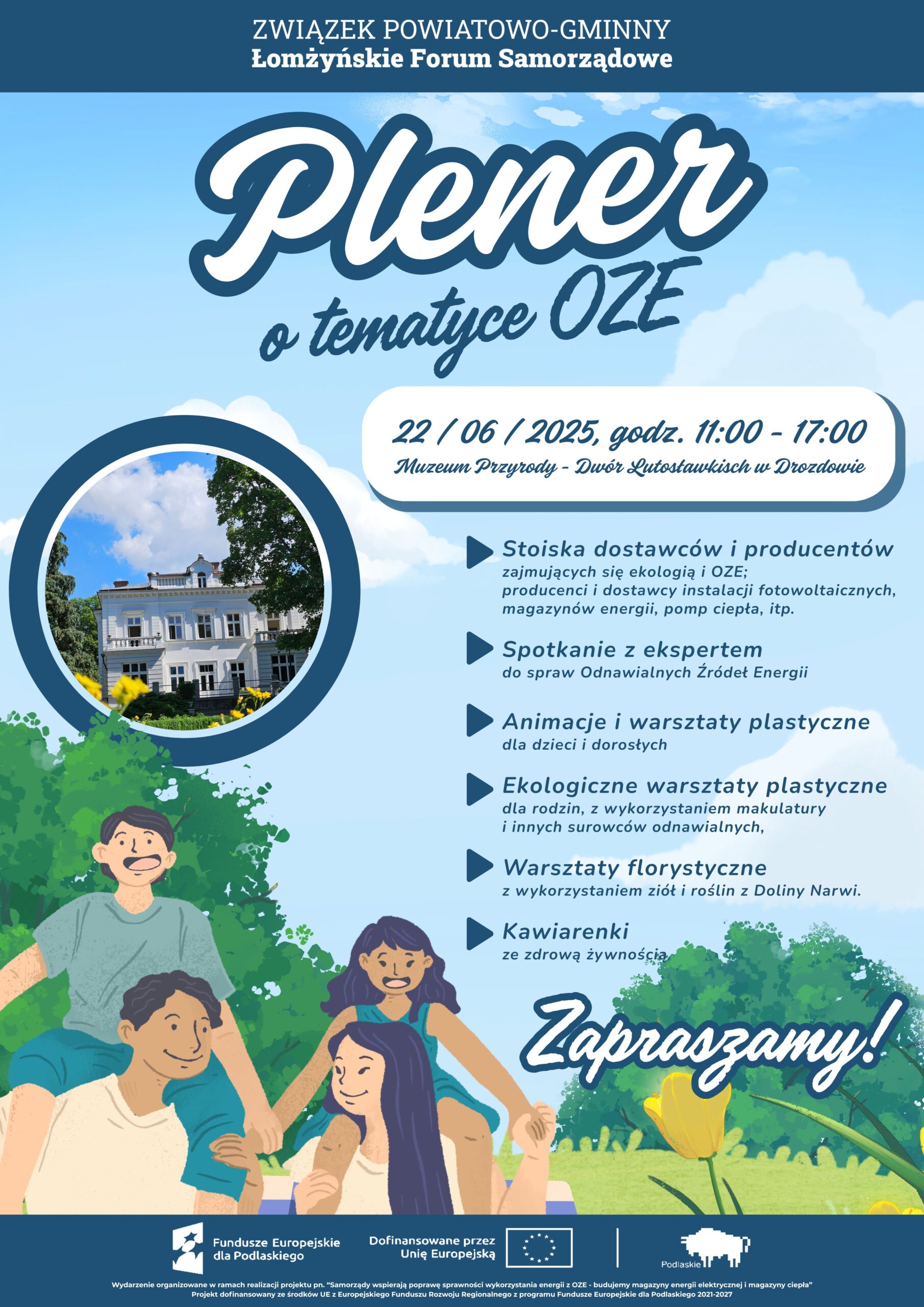 Już w niedzielę (22.06) wszyscy mieszkańcy powiatu łomżyńskiego oraz gmin Kolno, Zambrów i Sokoły zainteresowani tematyką Odnawialnych Źródeł Energii będą mogli poszerzyć swoją wiedzę w tym zakresie. Związek Powiatowo-Gminny „Łomżyńskie Forum Samorządowe” zaprasza na wydarzenie plenerowe w Muzeum Przyrody – Dworze Lutosławskich w Drozdowie.
