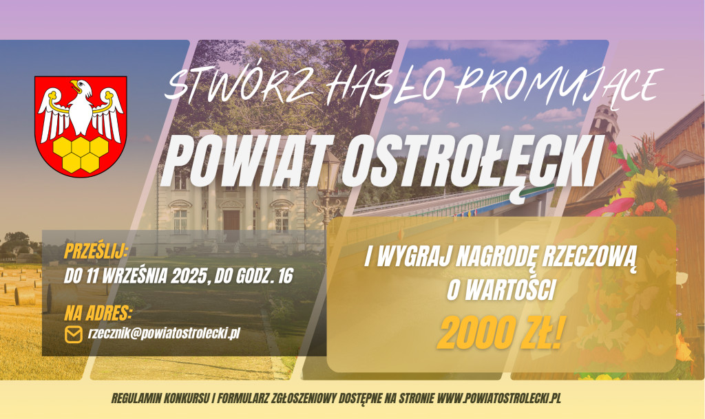 Stwórz hasło promujące Powiat Ostrołęcki i wygraj wartościową nagrodę rzeczową! Tylko do 11 września Starostwo Powiatowe w Ostrołęce czeka na propozycje słów, które mają szansę stać się wizytówką całego powiatu.