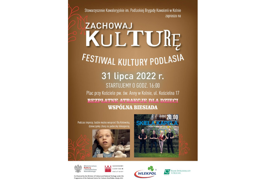 Festiwal Kultury Podlasia „Zachowaj Kulturę” rozpocznie się 31 lipca o g. 16.00 na placu przy kościele pw. św. Anny ul. Kościelna 17 w Kolnie.