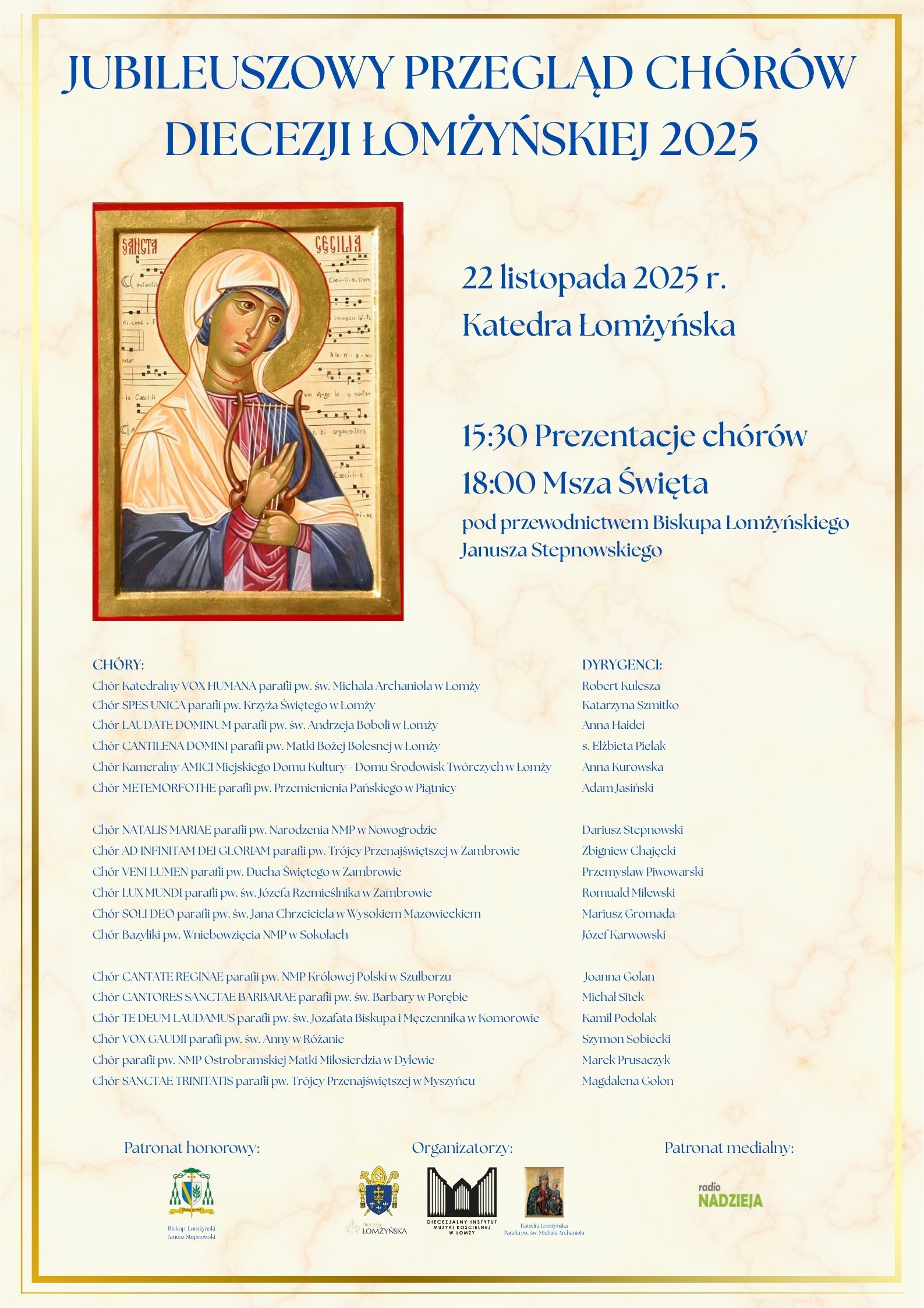 – Wydarzenie to ma szczególny charakter, ponieważ wpisuje się w obchody Roku Jubileuszowego, w którym dziękujemy Panu Bogu za 100 lat istnienia Diecezji Łomżyńskiej. Przegląd ten przypada na liturgiczne wspomnienie świętej Cecylii, patronki muzyki kościelnej, co dodatkowo nadaje wydarzeniu uroczysty wymiar. Celem przeglądu jest przede wszystkim wspólna modlitwa oraz uwielbienie Pana Boga poprzez śpiew – podkreślił kapłan.