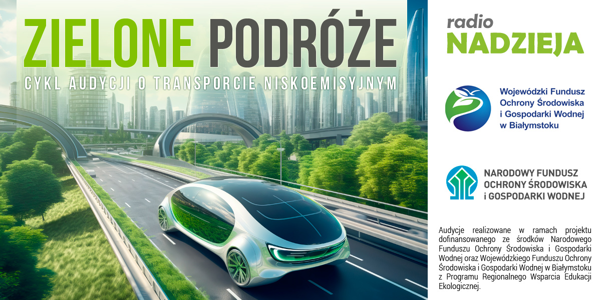 Niskoemisyjny transport: szansa czy zagrożenie? Samochód elektryczny czy spalinowy? Rower czy hulajnoga? Środki transportu a środowisko. Dobre praktyki i nowoczesne rozwiązania. Na te i wiele innych pytań poszukamy odpowiedzi w audycji “Zielone Podróże”. Audycje realizowane w ramach projektu dofinansowanego ze środków Narodowego Funduszu Ochrony Środowiska i Gospodarki Wodnej oraz Wojewódzkiego Funduszu Ochrony Środowiska i Gospodarki Wodnej w Białymstoku z Programu Regionalnego Wsparcia Edukacji Ekologicznej.