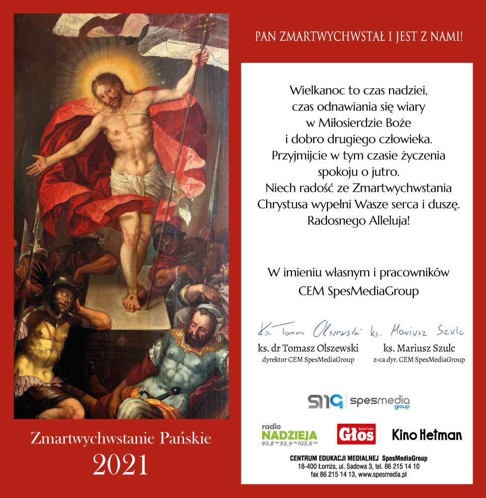 Wielkanoc to czas nadziei, czas odnawiania się wiary w Miłosierdzie Boże i dobro drugiego człowieka. Przyjmijcie w tym czasie życzenia spokoju na jutro. Niech radość ze Zmartwychwstania Chrystusa wypełni Wasze serca i duszę. Radosnego Alleluja!